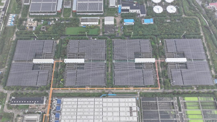 光伏項目:沉淀池上的“綠色發電站”持續賦能 竹園污水公司光伏項目創新性利用5~8號沉淀池頂部空間,通過水池四周鋼結構載體鋪設11000塊545瓦峰值單晶硅雙玻組件,配套28臺196千瓦組串式逆變器,將產生的直流電逆變為三相交流電后,經3臺箱式變壓器升壓后接入廠區2號主變6千伏母線側。項目于2024年1月8日開工,同年9月24日順利并網。截至2025年10月底,已實現累計發電808萬千瓦時,創造收益約642萬元,為企業直接節約電費約72萬元。